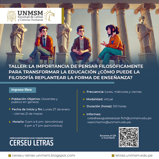 Este proyecto busca impulsar la relación entre el Departamento Académico de Filosofía de la Facultad de Letras y Ciencias Humanas de la UNMSM con la sociedad civil a través de talleres filosóficos que promuevan la utilización de herramientas de debate y construcción de argumentos a fin de consolidar una educación de calidad. Para lograrlo los docentes del Departamento de Filosofía participantes y otros invitados, incluso del extranjero se encargarán de las sesiones del taller dirigido principalmente a los docentes de diferentes niveles y materias. De esta manera se busca generar un diálogo interdisciplinario.